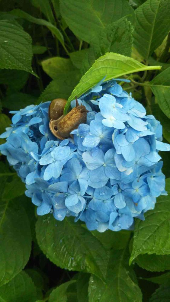 おはようございます☔️昨日友人が写メ送ってくれたカタツムリ..._@゚ノ゚付き紫陽花💙雨が良く似合いますね😊