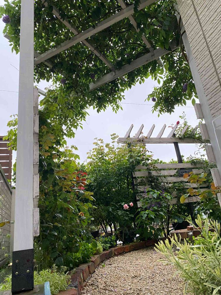 昨日の写真。アメリカ藤アメジストフォールが、一昨年DIYしたパーゴラを覆うようになってきました💜