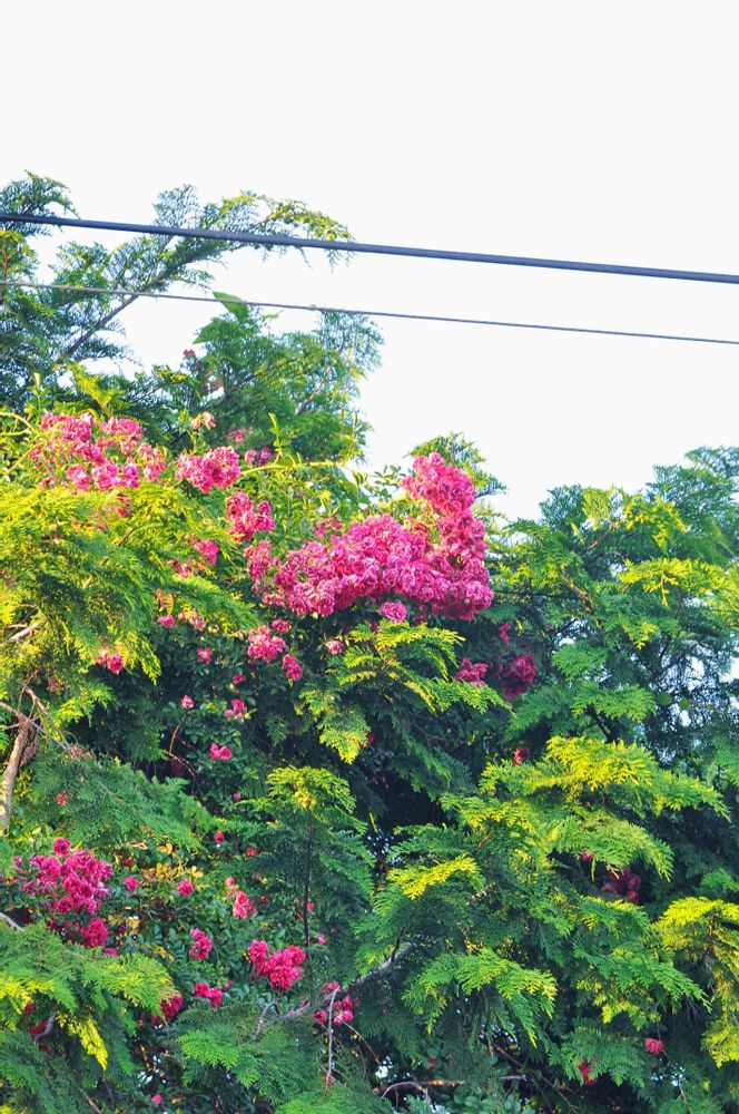 結構な大木の針葉樹に絡みついてる薔薇ですが、電線の高さくらいまであるんです。
