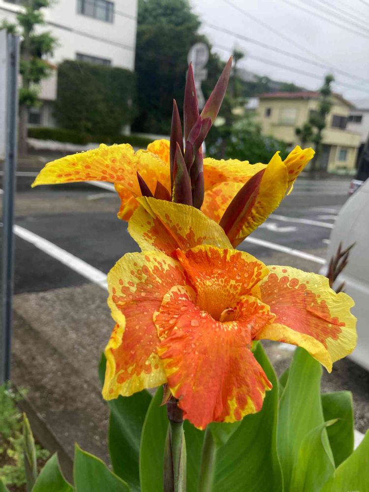 駐車場の隅にぽつんと咲いたカラフルカンナさん🧡