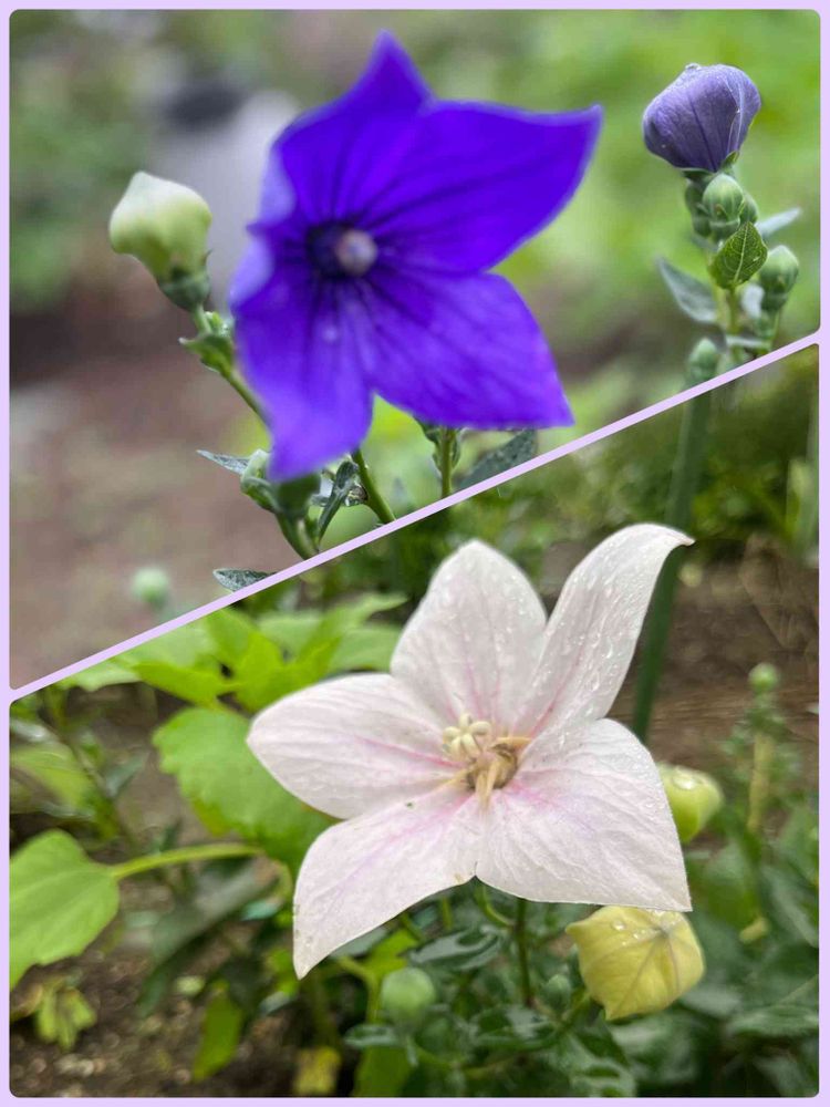 庭に出ると桔梗の花が咲いていました✨✨💜🤍✨✨今年はスッと伸びて切り花に出来そう💕蕾も可愛いです