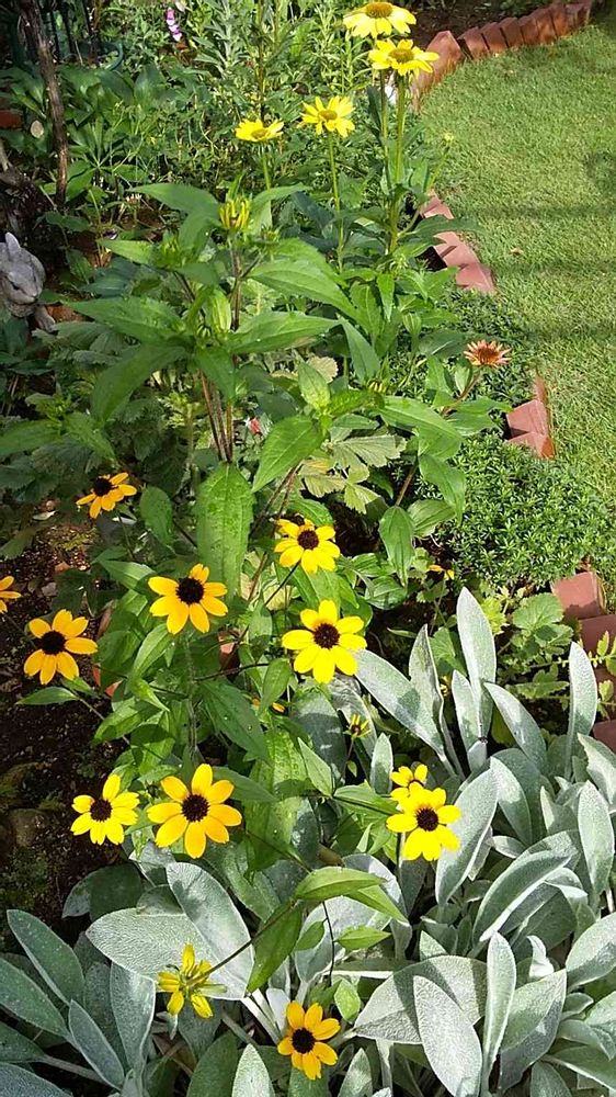 手前のラムズイヤーのシルバーリーフに黄色のルドベキア🌼