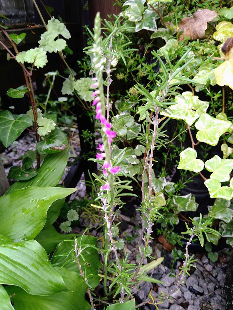 おはようございます(*´∀`*)ローズマリーの中から何と山野草のネジバナが.˚⊹ ⁺‧( *´꒳`*)‧⁺ ⊹˚.フシギ🤭