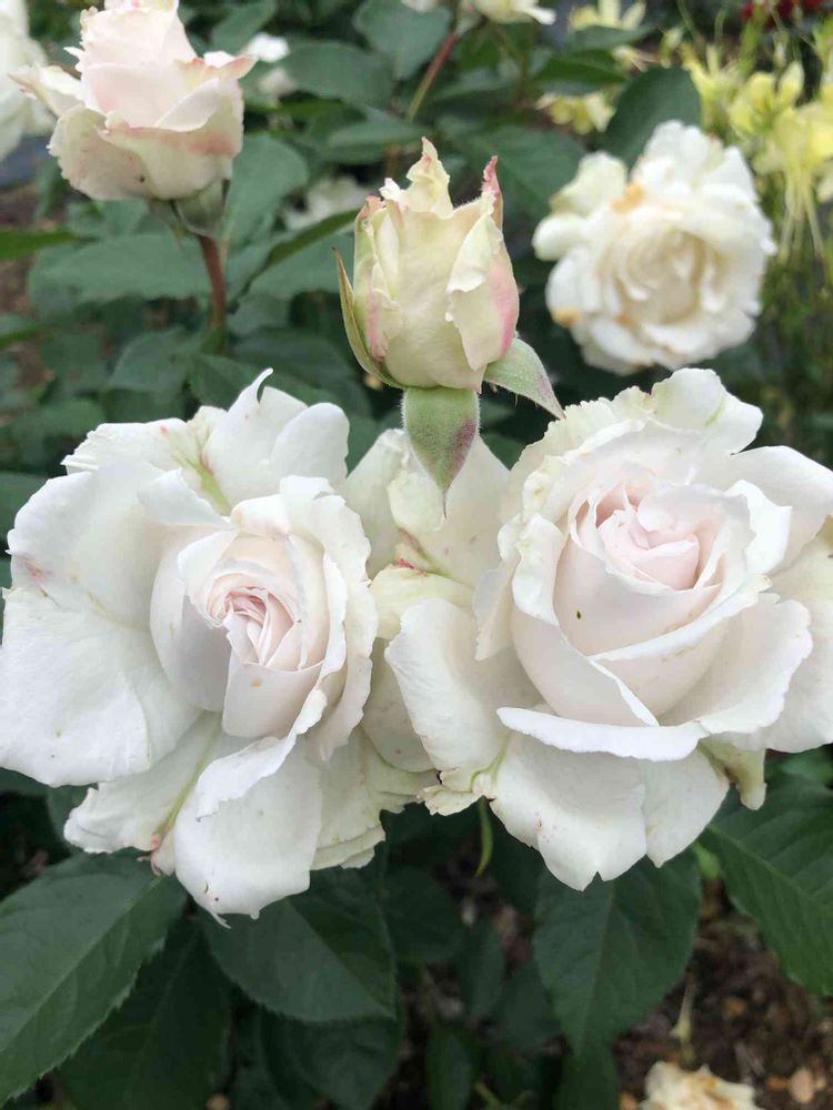 グレーがかった白、半剣弁咲き、中輪房咲きの花。ダマスクにティの強香で神秘的な香り。清楚な美しさを感じるバラ。