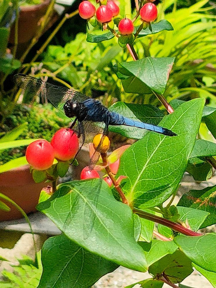 今日庭の手入れをしてたらヒペリカムの実にトンボが居て綺麗に撮れました🤳😍