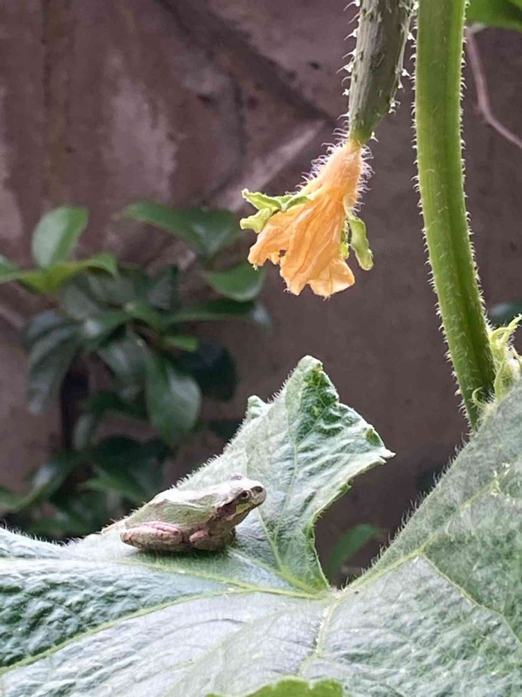 家庭菜園のきゅうりの葉っぱの上にアマガエルが佇んでいました❣️