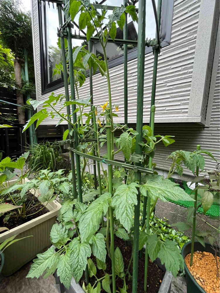 コンテナで2本ミニトマトのアイコが花を付け始めました 二人で毎朝サラダに入れて丁度いい コンテナで