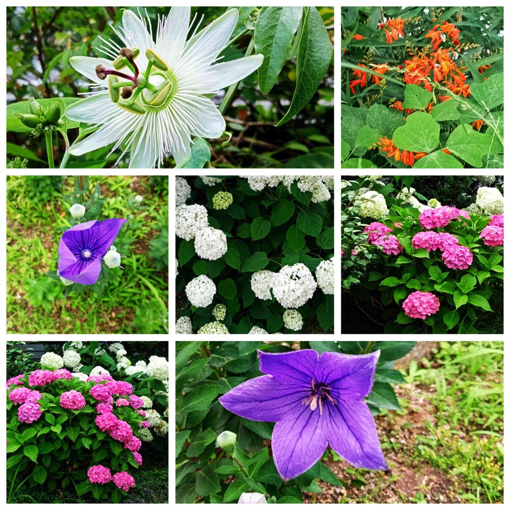 白花トケイソウ、ヒオウギスイセン、キキョウ、アマベル、アマベル紅白、紫陽花、キキョウ