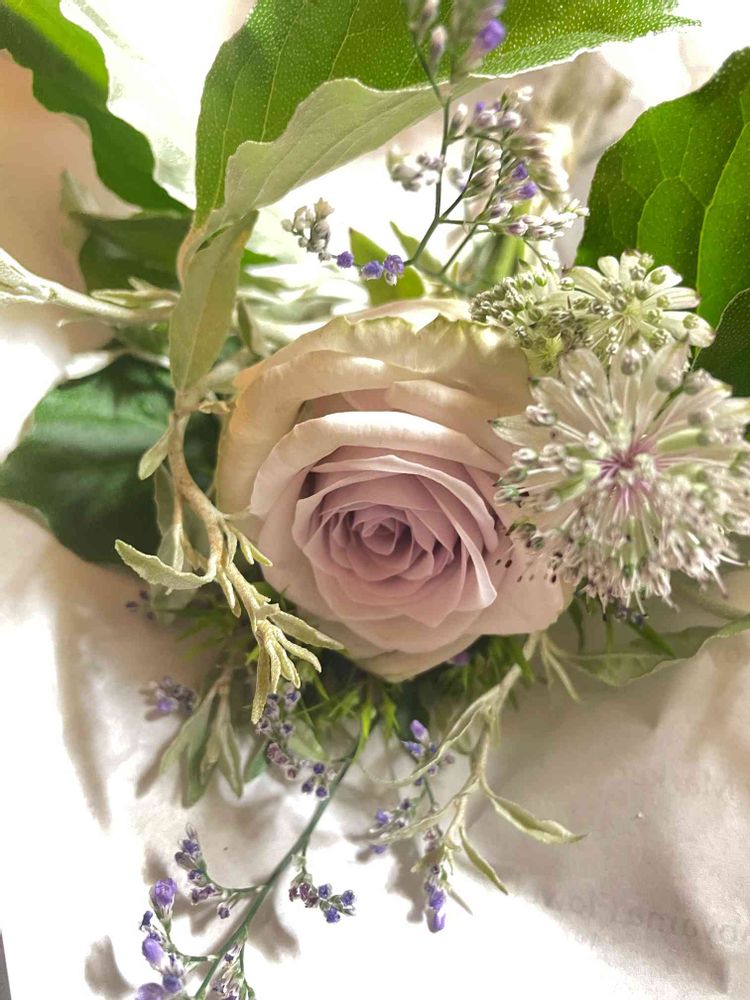 バラとアストランチア(マヨール)、銀葉マルグミ、ロシアンオリーブ