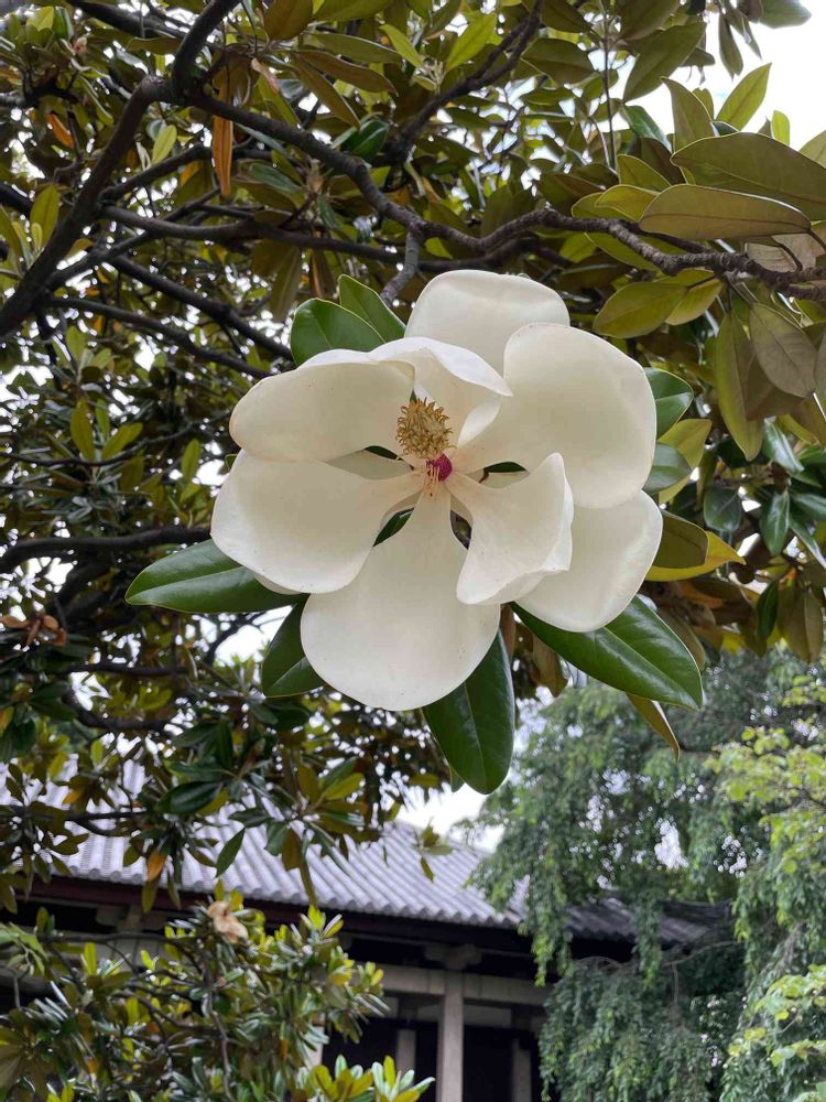 頭上高く、たくさん咲きます。お寺の境内の釈迦如来像の脇に植えられてます。