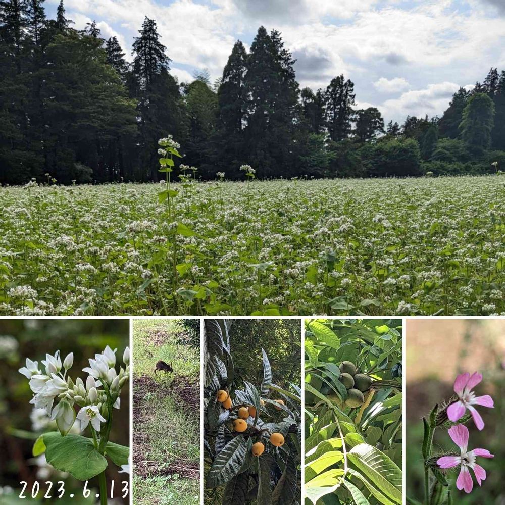 下段左→‥ソバの花、藪の中から突然飛び出してきたノウサギ🐇、ビワ、オニグルミ‥そして歩く足元に咲くピンクのマンテマ❀
