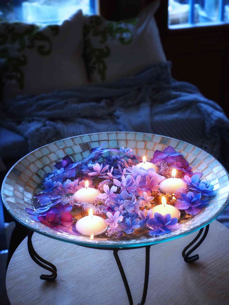 フローティングキャンドルを紫陽花に合わせるのは初めてでしたが、雨の日の薄暗さにしっくり似合ってくれました☺️