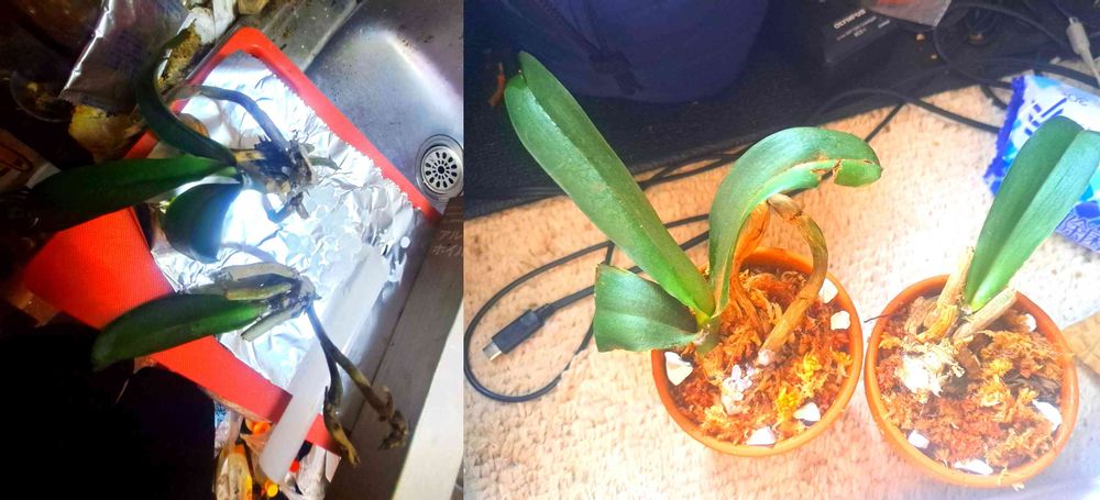 真ん中の成長点から葉っぱが何枚か出れば大丈夫だけど、そこまでこの無理やりくっつけた葉っぱがもつのか?それによるかとも・・・・。今の家に来て、胡蝶蘭組の古株で・・・・・・・。
