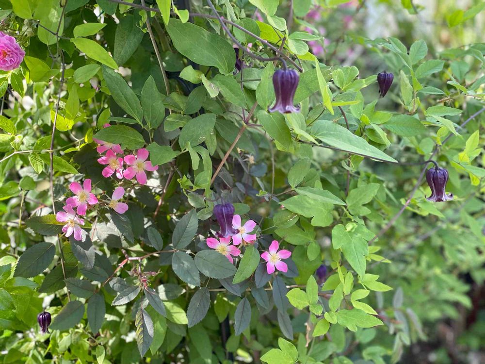 今日のオールド三種のラスト✨ 地味picだけど、ロサグラウカ(ロサルブリフォリア)とクレマチス煌弧(あきこ)💜🩷 グラウカは今はすでにローズヒップになっています🍒煌弧ちゃん よく咲いてくれるの〜🎶 あ、見えにくいけど、せっかくベル型なので チロリン隊のタグ付けせてもらおう🏷