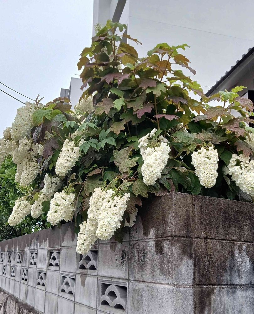 近所の友達の家に柏葉紫陽花がたくさん咲いています。