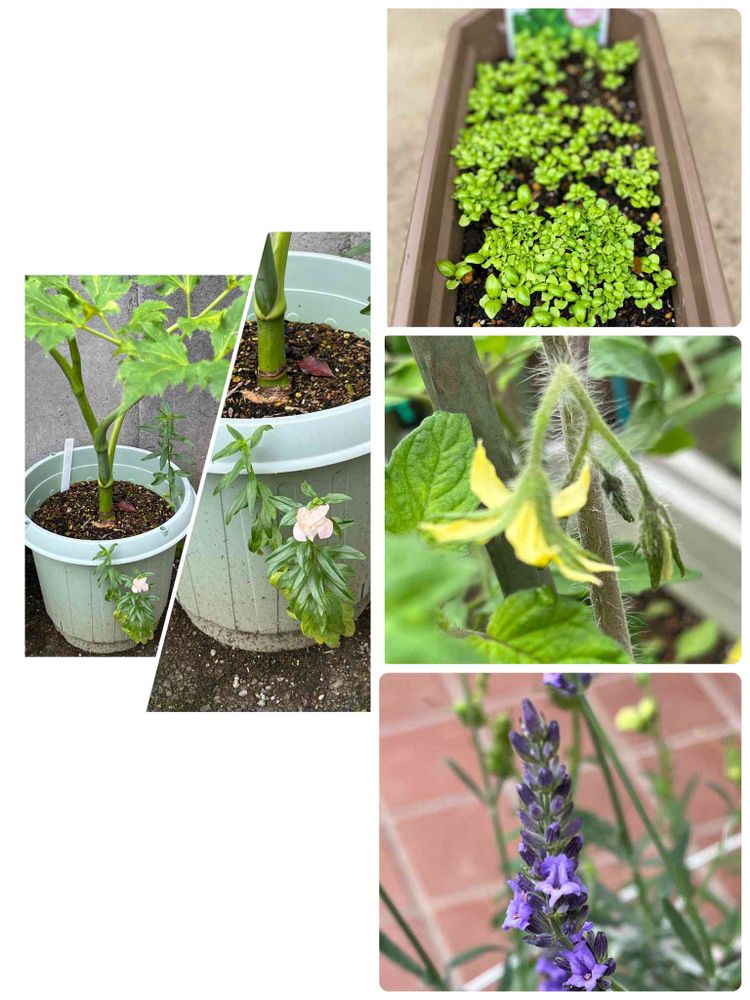 おはようございます。曇り、21.3℃、8:50ちょうどいい。明日葉の鉢の隙間からキンギョ草、花が咲きました。100均バジル、たくさん発芽、そろそろ間引きしないと、、、。種からの中玉トマト、花が咲きました。ラベンダー、花が咲き始め、良い匂いがしてきます。😻☺️😍☺️😋😸