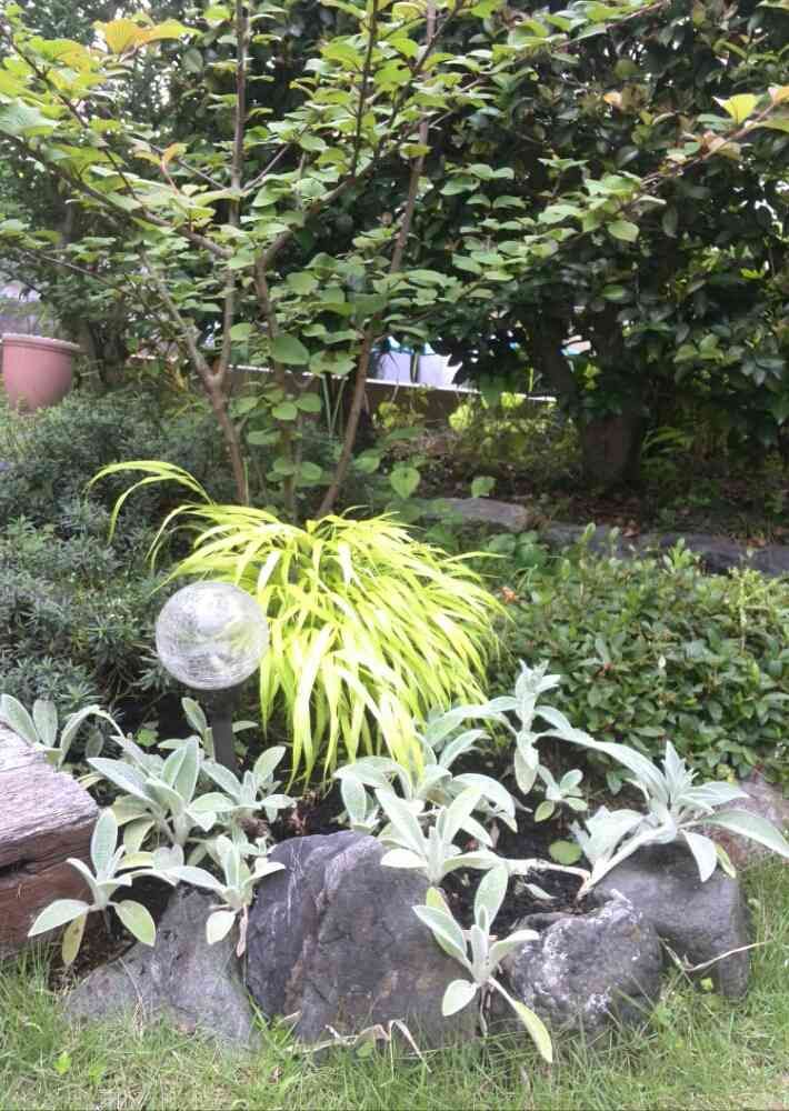 ラムズイヤーの枯れ取りと、花を切って雑草ぬきし、堆肥を入れたら見違えました。