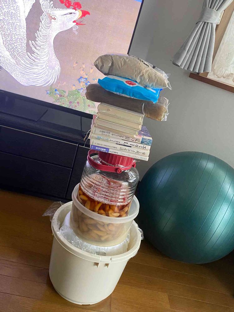 漬け物石にお米も乗せています😊
