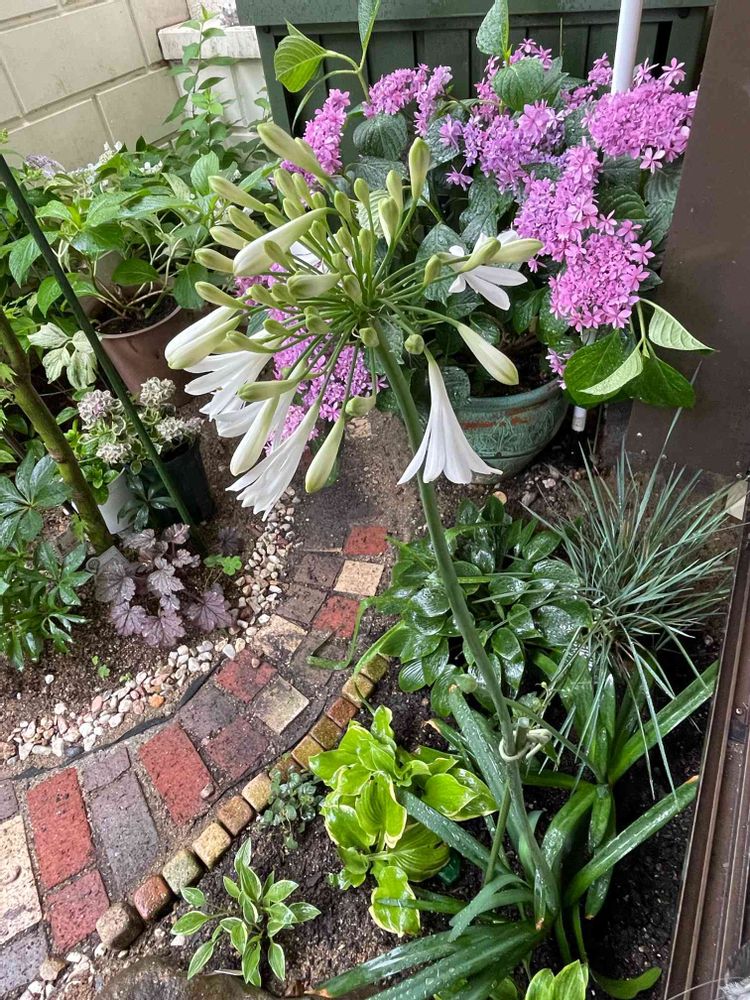 こんにちは〜昨年迎えたアガパンサスが咲きました😊後ろはダンスパーティ、昨年強剪定したけど圧巻の花数💕