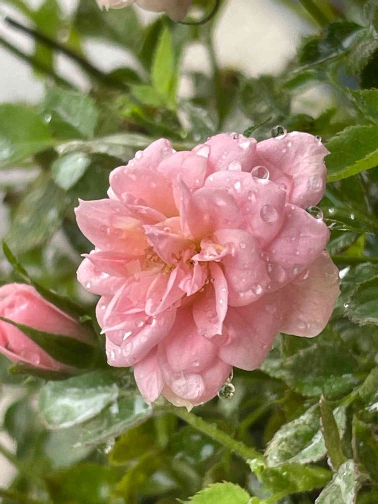 雨にぬれた姿もかわいい、ミニバラ🌹さん。
