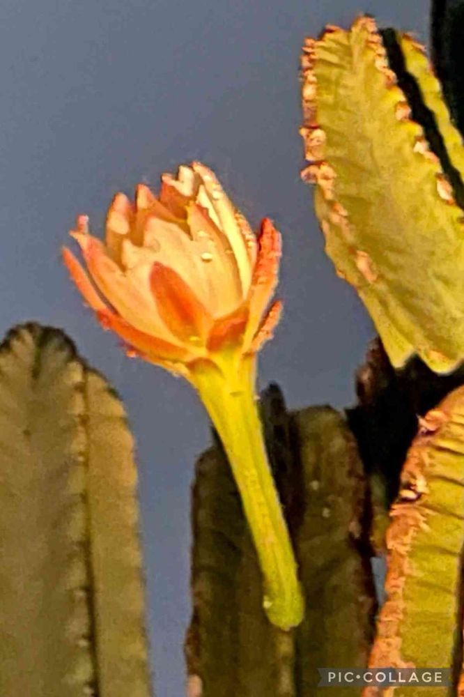 高いところに咲くんですよ。下の方に咲いた事が無いです。懐中電灯を当ててるからオレンジ色に見えますが薄ピンク色です。