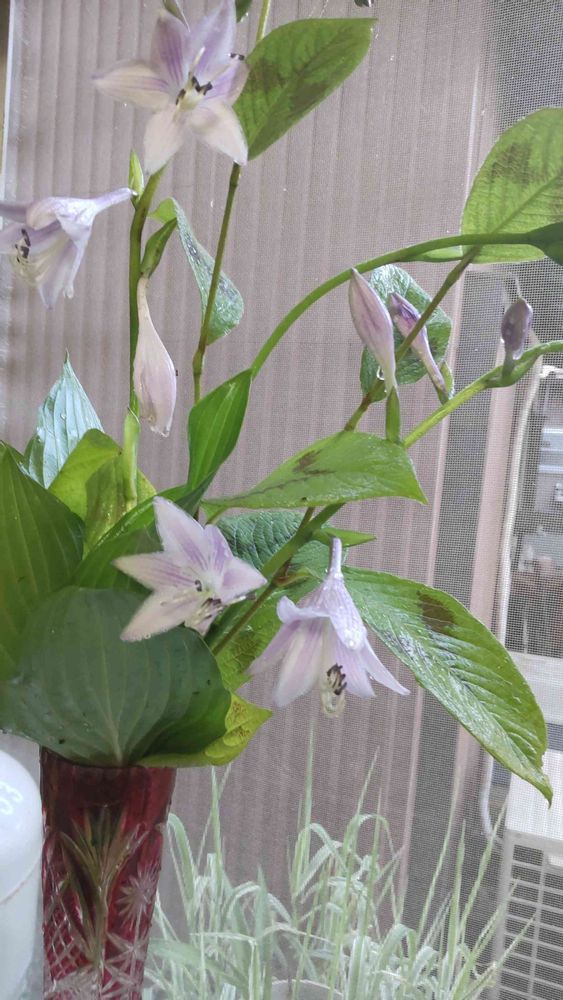 今日のキッチンフラワー🤍💚ギボウシ、みずひき💙こんなに、間近に、しげしげ、見たこと、無かった、可愛いね、😄💚