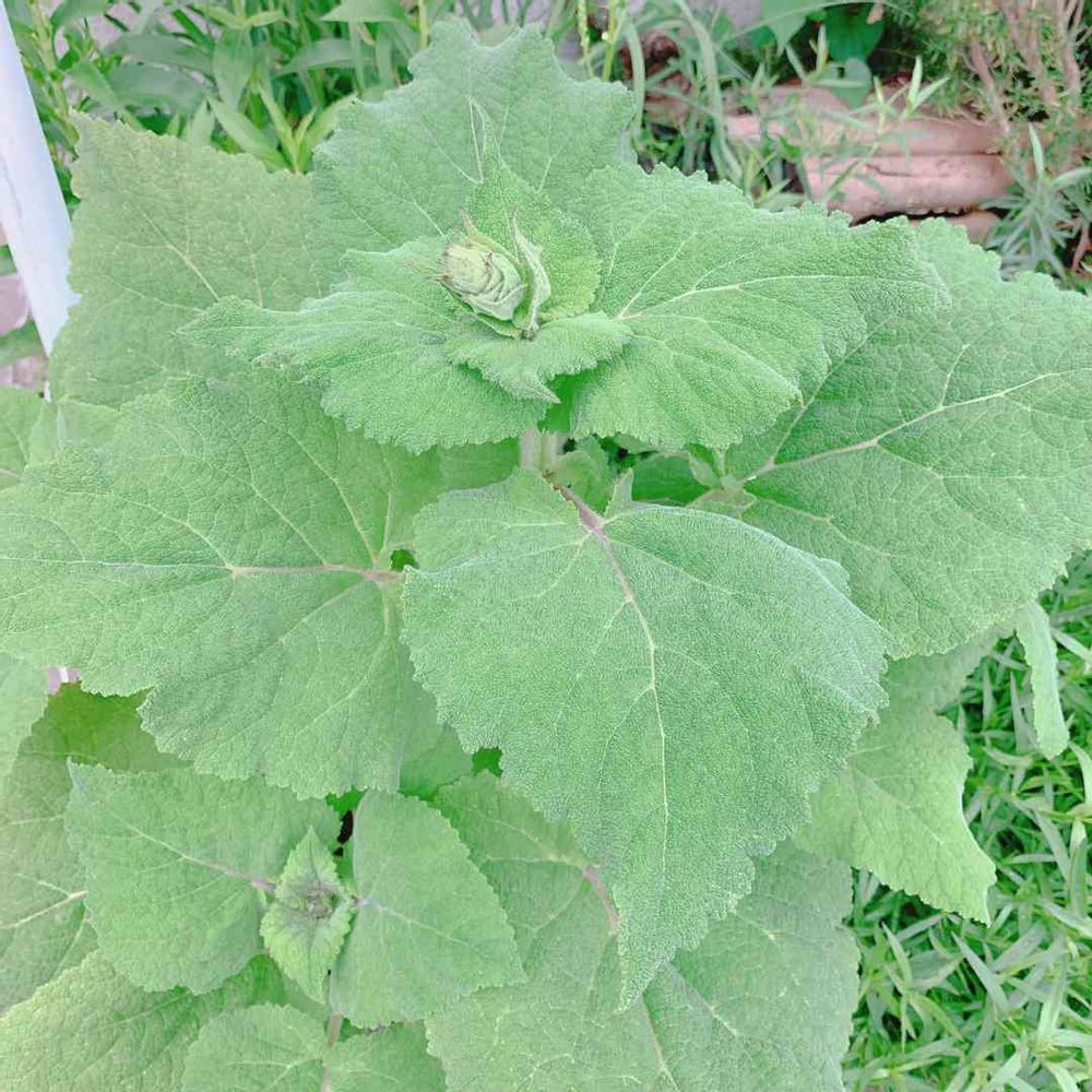 大きな葉の中から花芽がなぜ横向きに生えてくるのか……謎です🤣