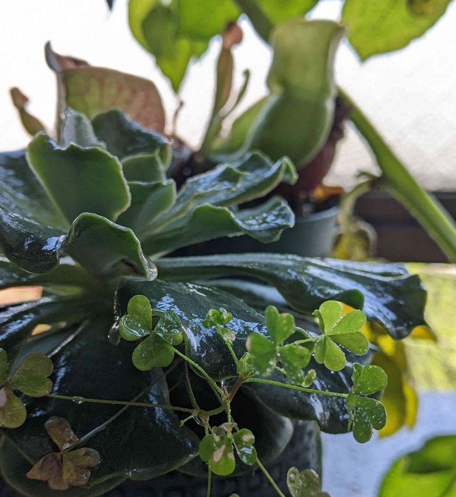 ブルーフリルズと、ブルーフリルズの鉢にいつからか生えてきたカタバミです。