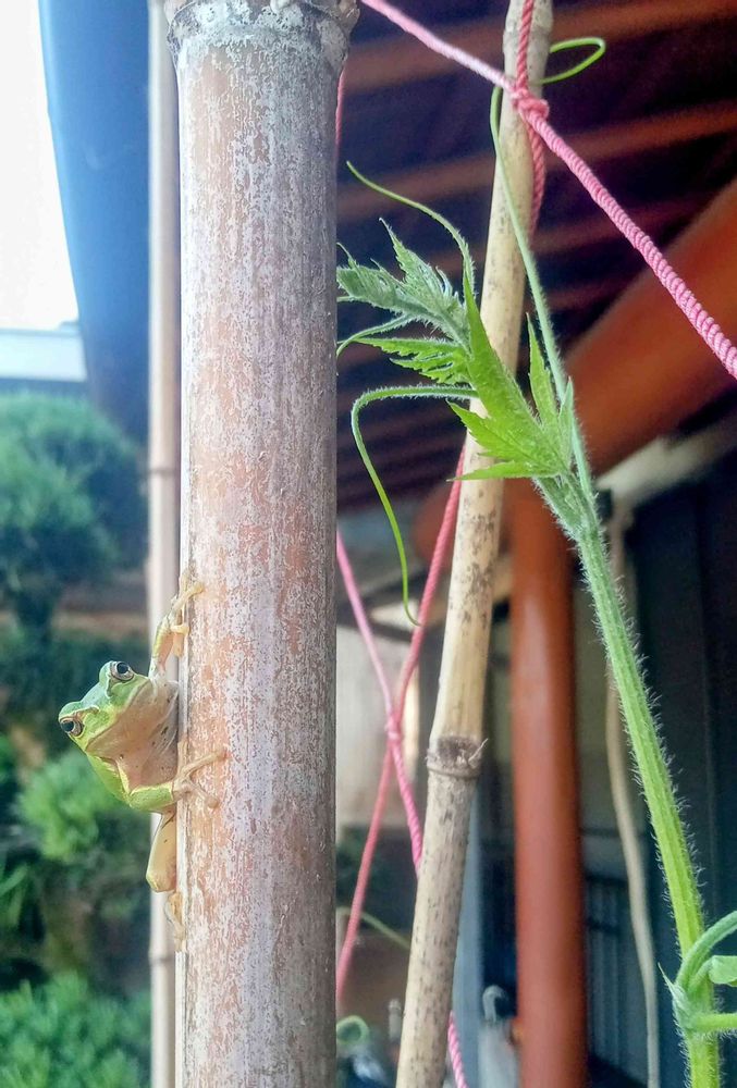 ひょっこりはん🥸ならぬ、ひょっこりカエルちゃん🐸🫰✨ゴーヤカーテン🥒デカくなってきたケロよ🙌🙌🙌