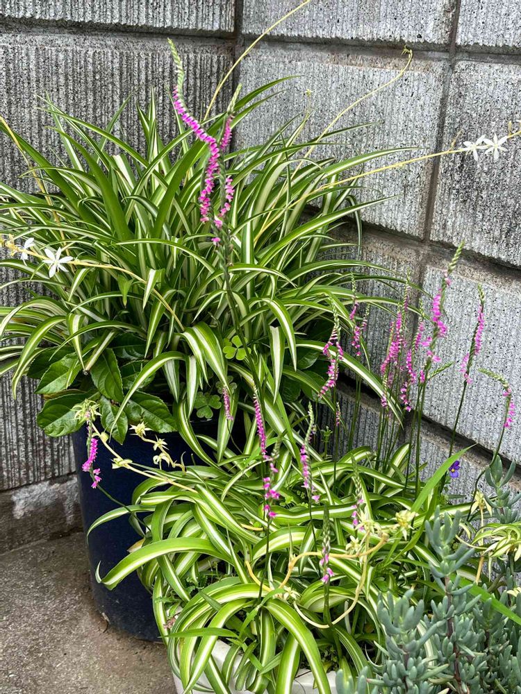 オリヅルランの白い花にピンクの花まで…可愛いです!!私も真似して見ようかな❤