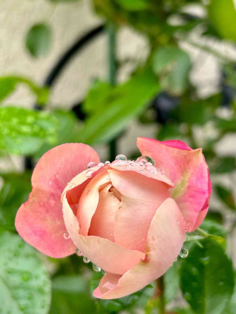 今日の庭バラ🌹🌹 カップ咲きアプリコット色のアクロポリス・ロマンティカ、雨の中☔️早くも2番花の一輪蕾が膨らんで開花間近
