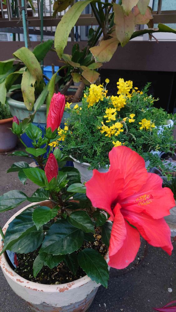 🌺ハイビスカス🌺とエニシダのコラボだね🏖️夏はもうそこまで来てます、女優バリのGSの庭活ギャル&おばさんギャルの皆さまも日焼け止めクリームぬりぬりしてくださいね👾