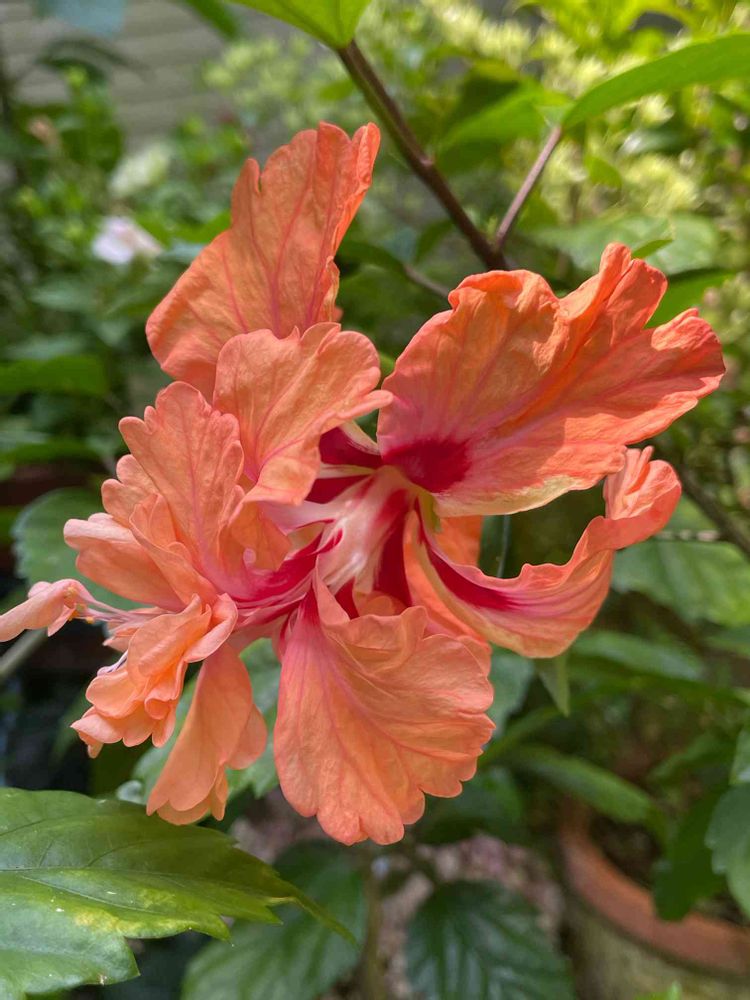 レッドフラミンゴと風鈴仏桑華と3つハイビスカスがありますが、みんな変わってます。オレンジと、レッドは2段に花が咲きます。