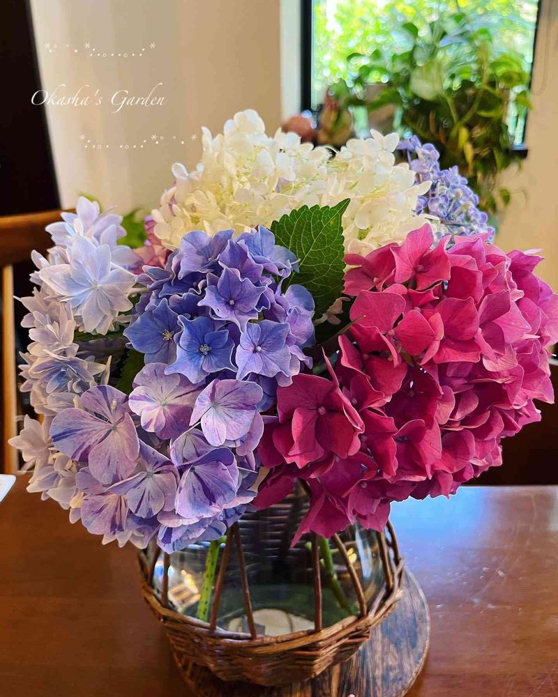そう!紫陽花を一株から沢山はカットできない!(もったいなくて😂)裏側に咲いてるのを1品種ひと枝ずつカットしました✂️