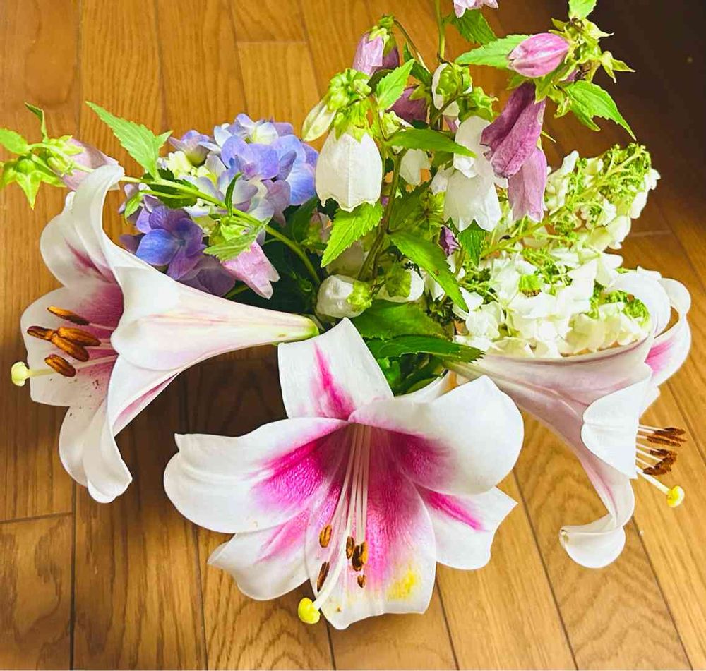 我が家の小さな庭のテッボウユリトライアンファクターが台風前に咲き始め、やむなく切り花になりました😅このユリは通勤路のバス停近くの方にいただき、一株から毎年増えている様子です💕