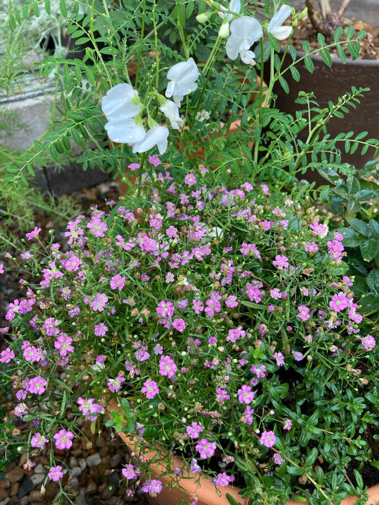 薔薇メインの寄せ植えだったけど、薔薇が終わってからはかすみ草が元気に咲いてる😊スワインソナも頑張れ〜