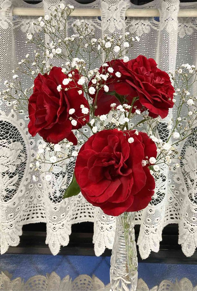 お庭の真紅の🌹と毎年咲いてくれるカスミソウを✂️出窓に🤗💕
