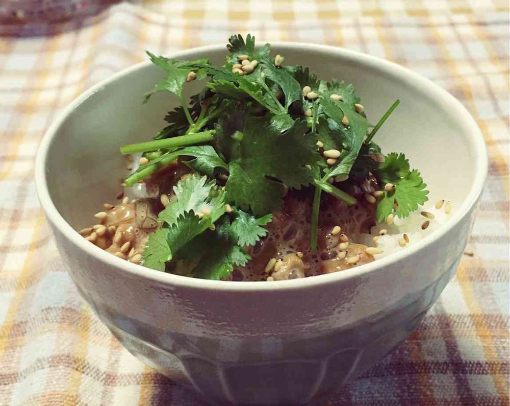 パクチーを納豆と食べるのが以前から好きだったのですが、自分で収穫したパクチーをのせて食べるのは一層美味しいですね。