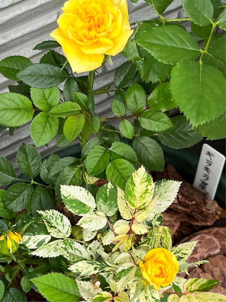 迎えて2年目のキラキラ星 初めての冬を玄関で越して春から無事に成長して我が家のバラの中で一番目の花を咲かせてくれました 同じ木から斑入りの葉も出ます