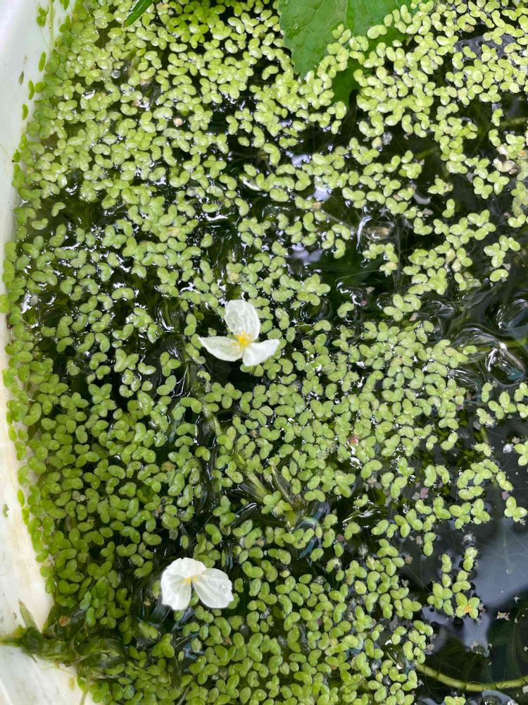 メダカ鉢のアオウキクサは 増えまくりやっかいな浮草 たまに 取ってるけど またすぐ増える😫^ - ^ 下にはアナカリス見えんけど笑 花が咲いてますぜ アオウキクサの花ではありませんよ🐼🌟