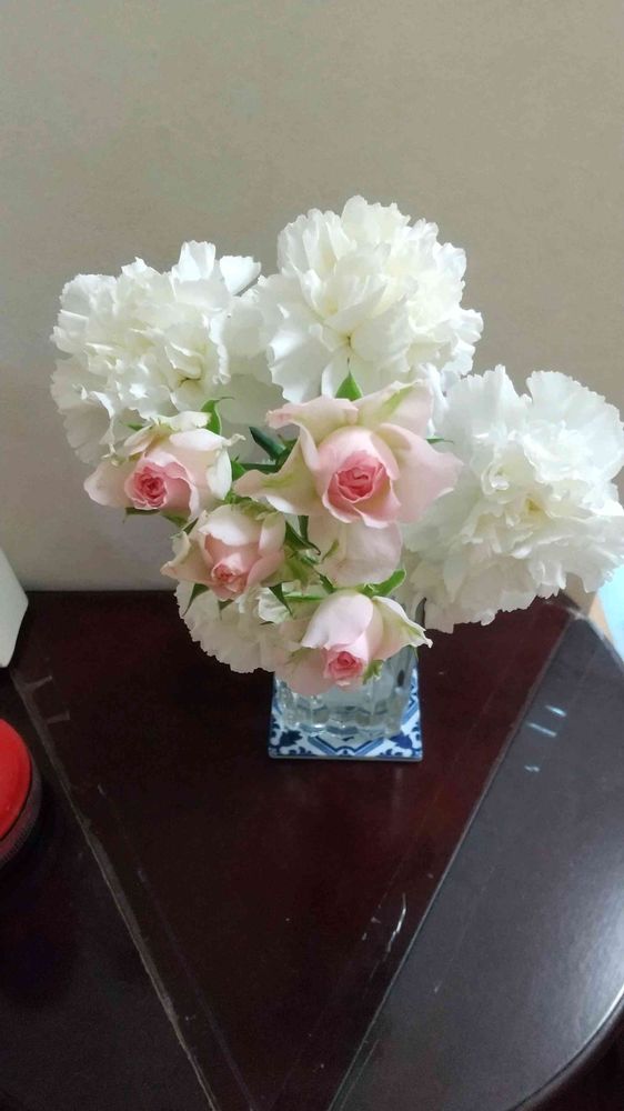 白いカーネーションだけでは寂しいのでバラ🌹も添えてあげました。