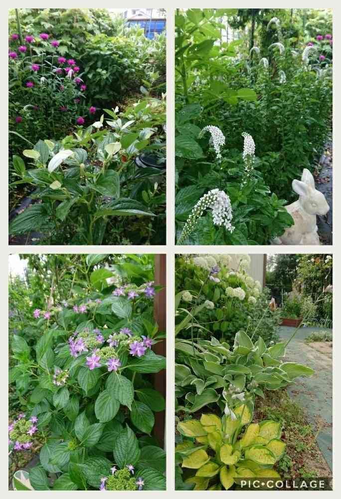 ライム色のホスタに白いお花、寒河江には紫のお花が咲いてい