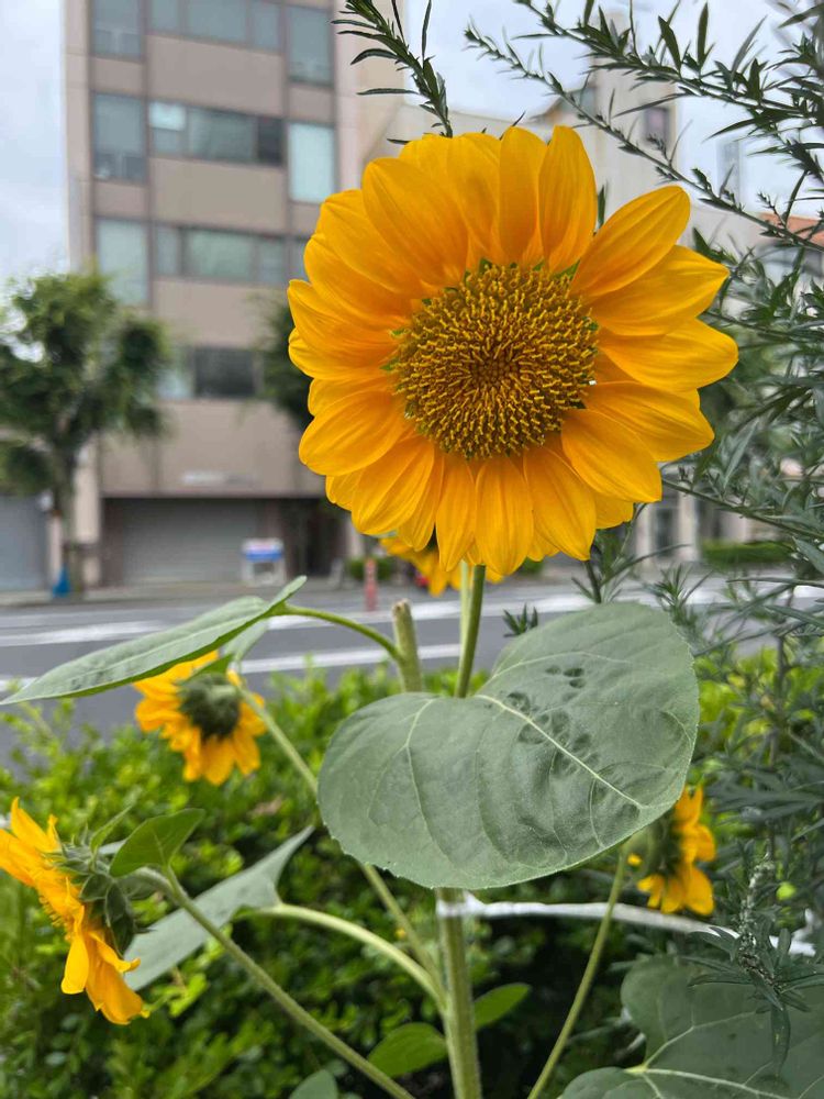 曇り空の下、ひまわりがパカっと咲いてました。元気出していこうって!?