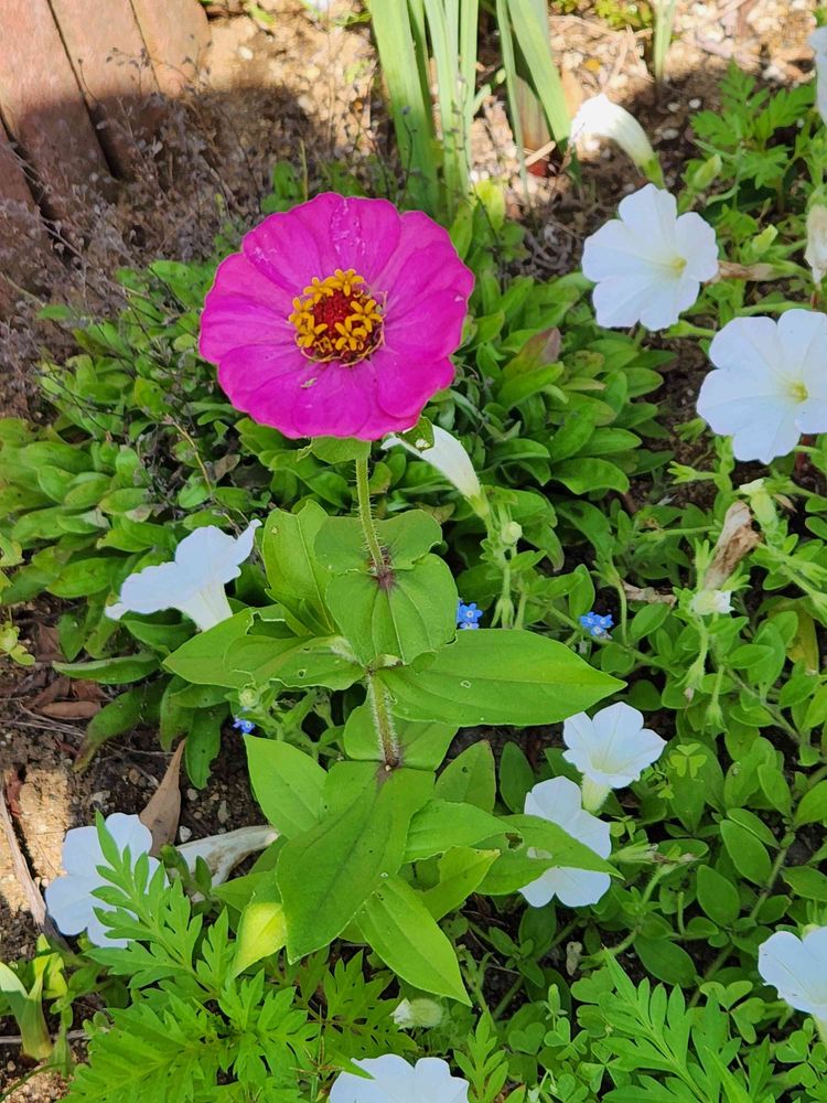 地植えのペチュニアの間からこぼれ種で咲いたジニアさん💕
