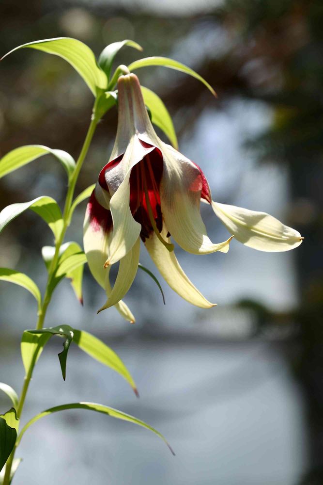 ウコンユリはヒマラヤ原産のユリでヒマラヤからチベット、雲南、ミャンマー、タイ北部などに分布し野生のユリには珍しく花が複色で花びらの先が黄緑色で中心部分が茶紫色をしています。