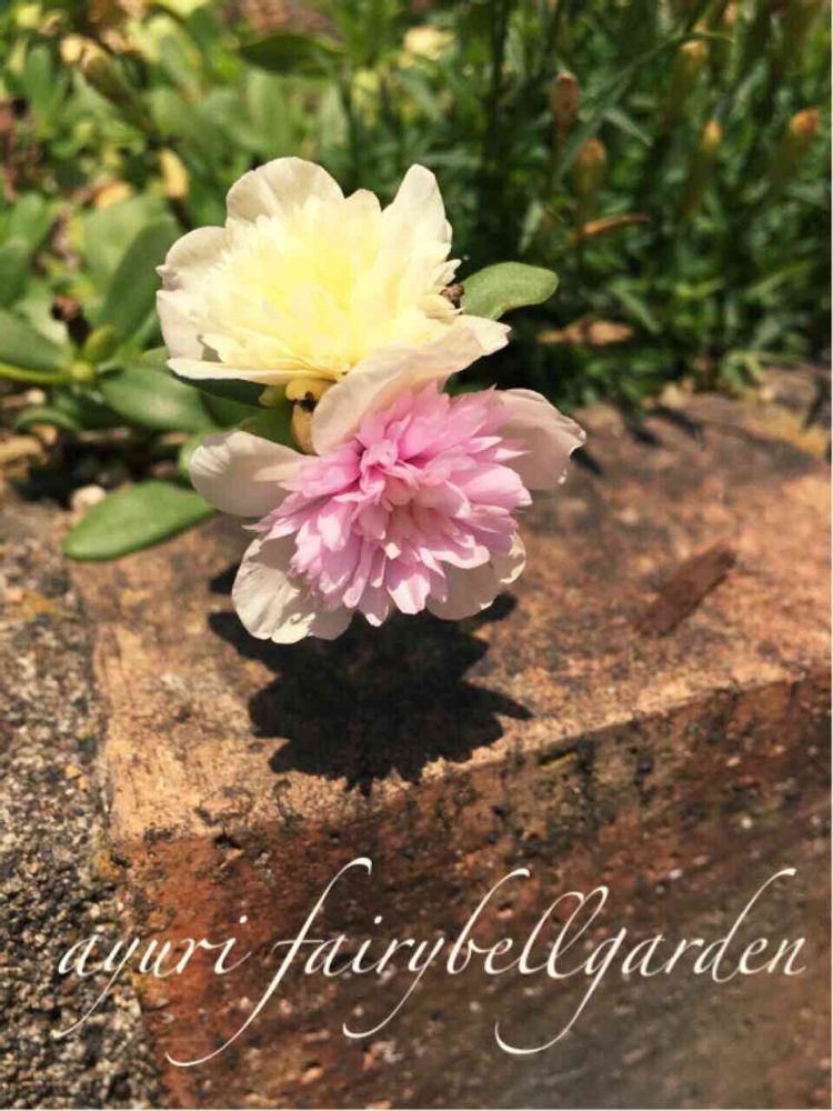 ホワイト&ピンクのポーチュラカ仲良くくっついて開花してました。可愛くて、お出かけ前に門扉前で、パチリ。誰もいなくて良かった笑