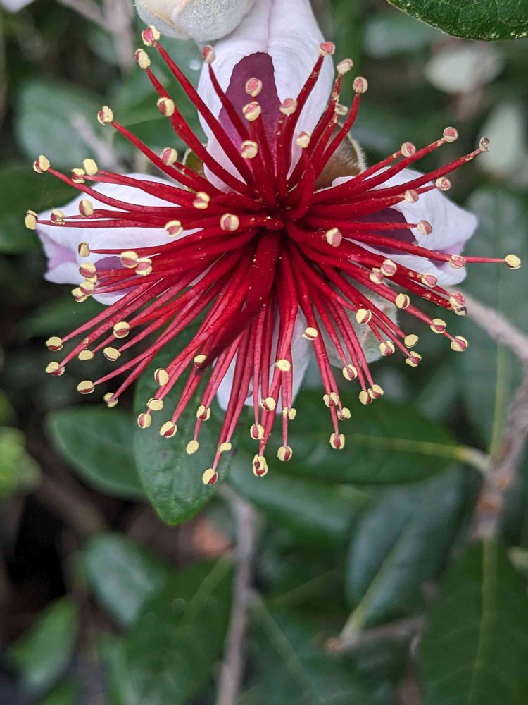 後で調べたら、別名、パイナップルグアバとも呼び、果実はパイナップルとバナナとリンゴを混ぜたような味で甘い香りがする特徴ですとありました🤓👍
