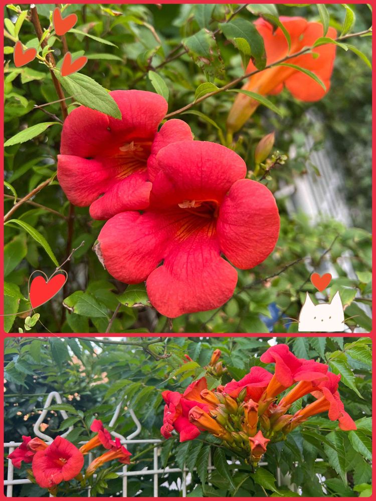 おはようございます💕こんなに真っ赤なノウゼンカズラ初めて見ました😳元気貰えそう✌