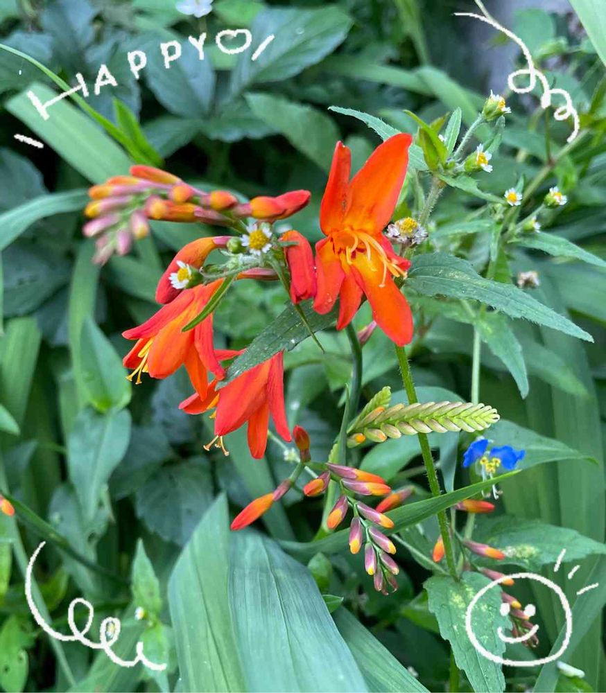 生垣の下にヒメヒオウギズイセンが咲いてきました♬ツユクサも一緒で〜す😍