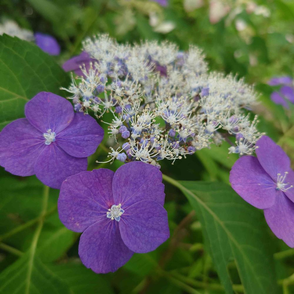 ヤマアジサイ系統の「宵の星」、両性花がきらめいてみえるからかと思ったら、がくの斑入りを星に見立てているという説も…